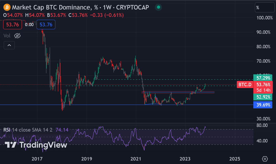 O indicador BTC.D (veja a newsletter #6 para mais detalhes) continua a estabelecer novas mínimas mais altas, o que é a definição de uma tendência de alta. Acabamos de fechar uma resistência significativa de 53% no gráfico semanal.