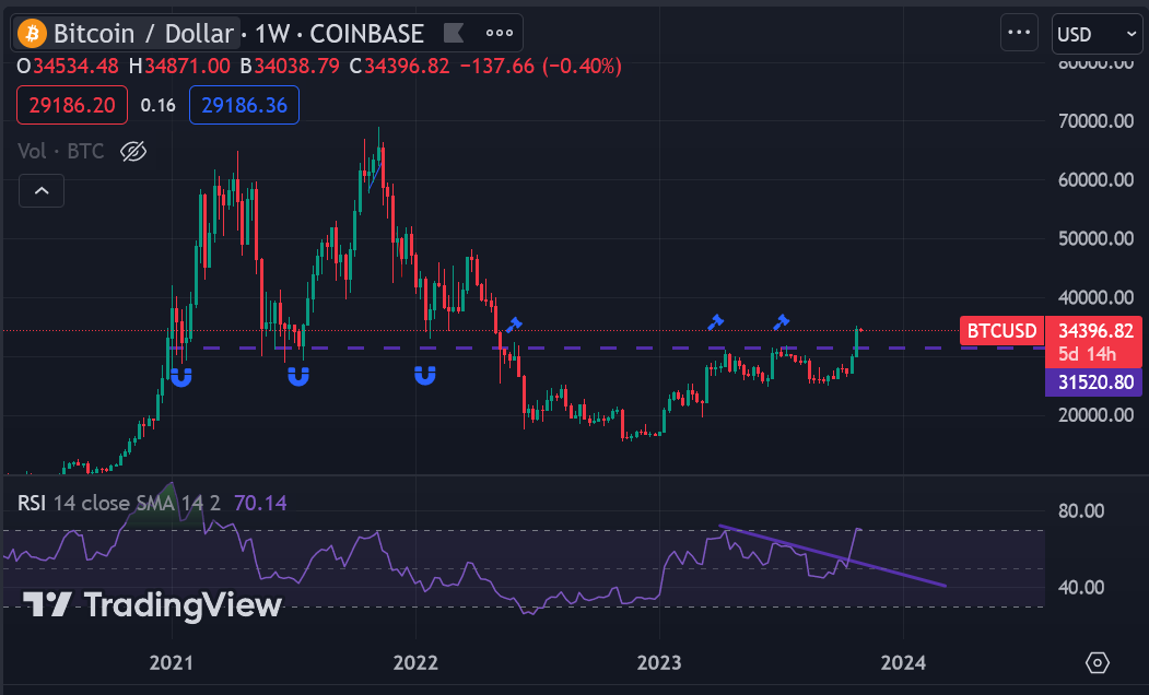 Sinais otimistas: O Bitcoin ultrapassou a resistência de $31,500 no gráfico semanal.
