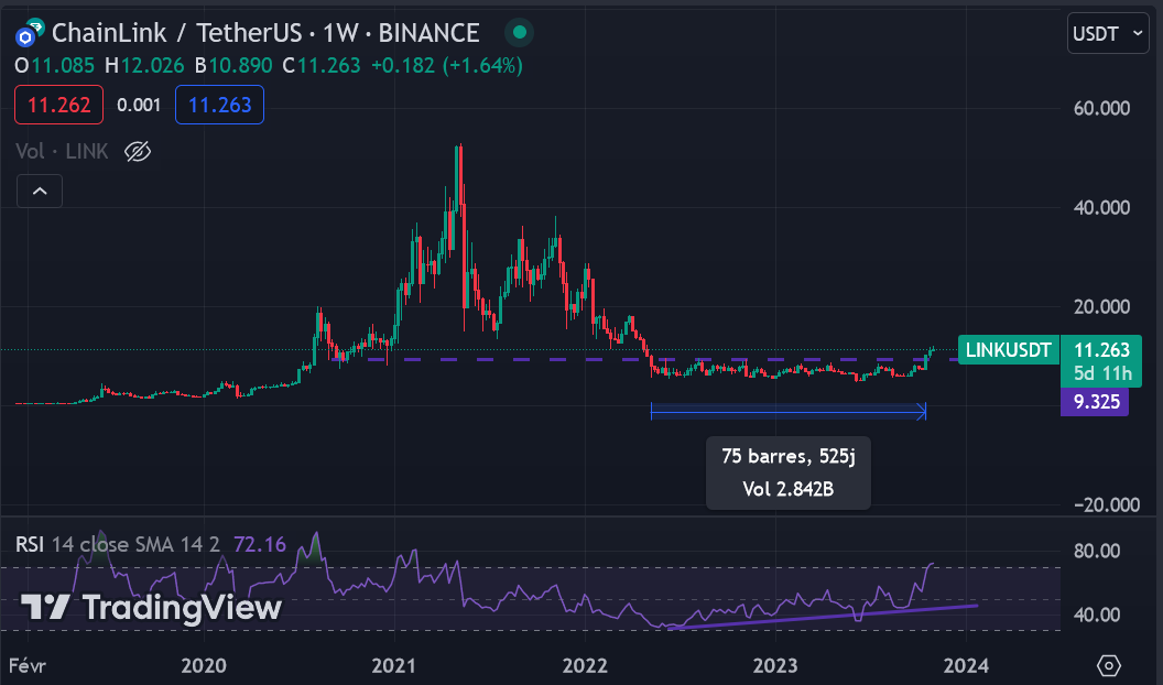 Vamos pegar um exemplo concreto. Temos o indicador TOTAL3, que ainda está em acumulação, como descrito em nossa análise. No entanto, a moeda $LINK já saiu de sua consolidação após 525 dias de acumulação: