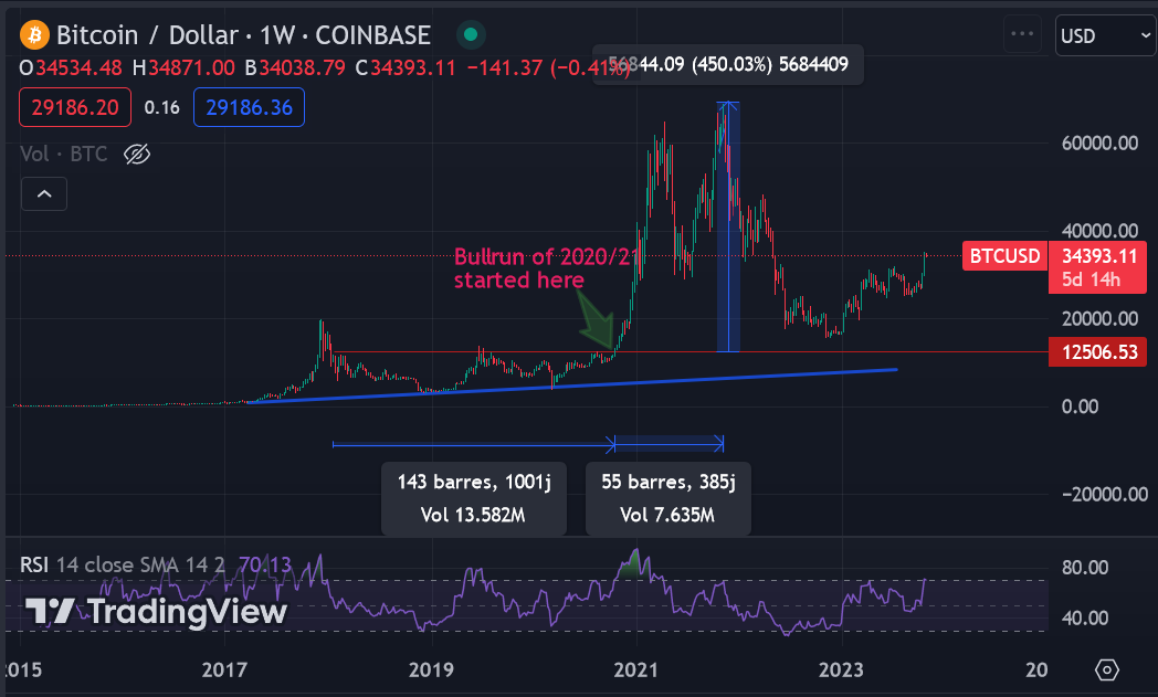 Antes do início do mercado de alta, passamos por uma fase de acumulação que começou em 2018 e durou 1000 dias. Isso foi seguido por um movimento explosivo, e o preço do Bitcoin se multiplicou por 5 em um ano.