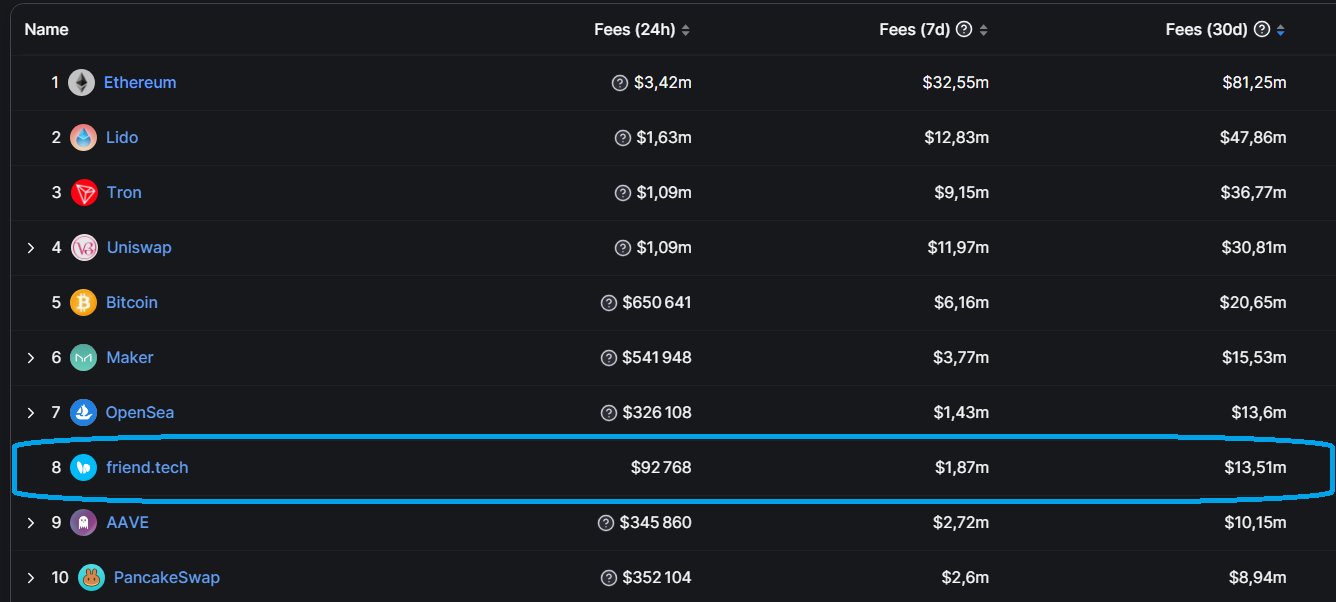 Desde o seu lançamento no início de agosto de 2023, o Friend.tech tem chamado muita atenção, devido à impressionante quantidade de taxas que gera. Com menos de 3 meses de existência e 40 milhões de dólares de TVL, o FT foi rapidamente elevado ao top 10 de projetos em termos de receita.