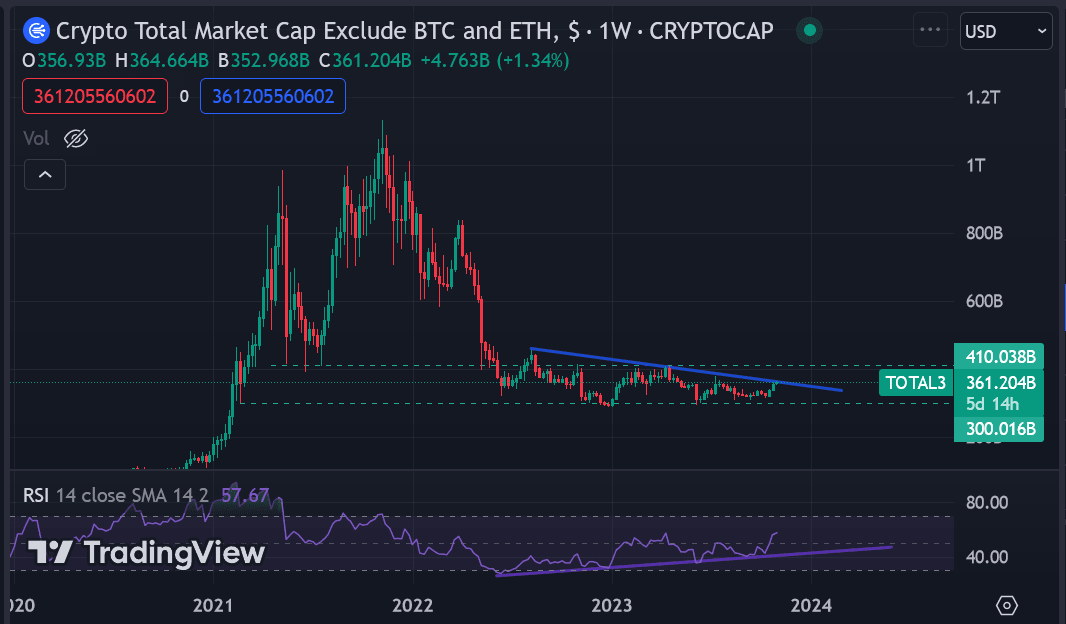 Vimos algumas recuperações impressionantes em algumas altcoins, o que é promissor. No entanto, a dominância do Bitcoin sobre as altcoins continua a crescer, e ainda não quebramos a tendência de baixa do índice TOTAL3. Além disso, até que o TOTAL3 quebre a resistência de US$ 410 bilhões, consideramos que o mercado de altcoins ainda está em consolidação, mesmo que algumas estejam começando sua corrida de alta. Vamos aprofundar isso na seção educacional.